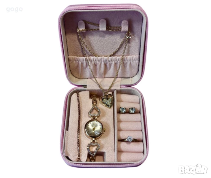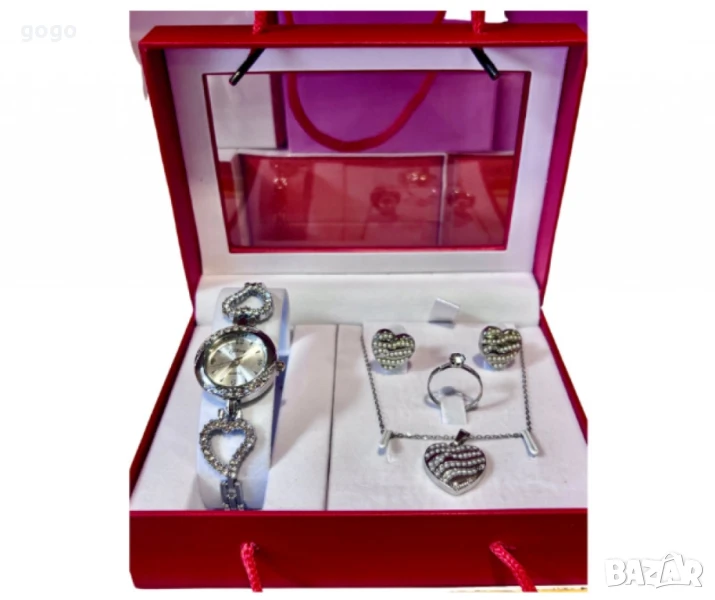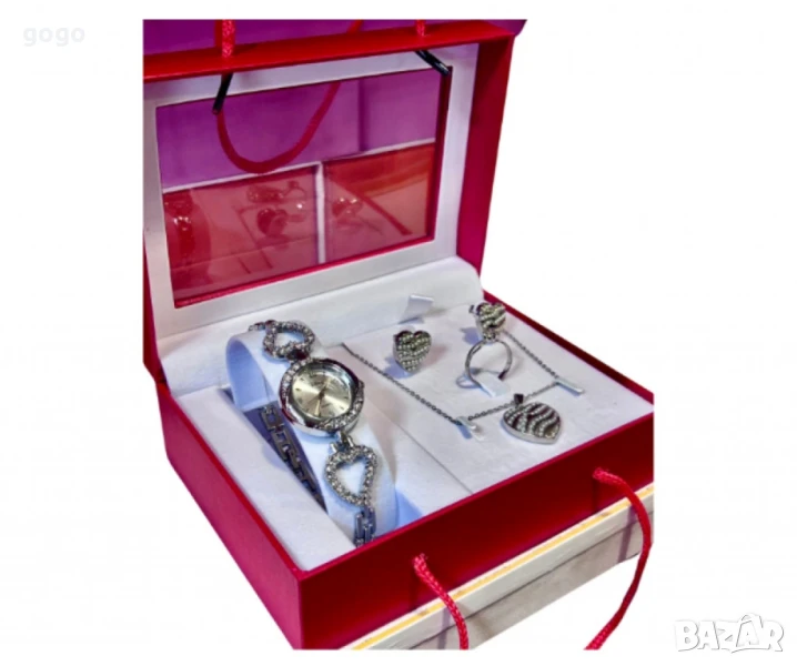 Дамски комплект Цена: 60 лева1.Луксозен дамски комплект часовник с бижута 4в1, идеалният подарък за изискани дамиВ този елегантен комплект ще откриете красиво изработен часовник, съчетан с прекрасно колие с форма на сърце, изтънчен пръстен и елегантни обеци с форма на сърце, които се допълват перфектно. Комплектът е наличен в два луксозни цвята – сребристо и златисто, изработен от висококачествена неръждаема стомана за дълготрайност и блясък. Всички елементи на комплекта се предлагат в луксозна подаръчна кутия. Перфектен избор за подарък за всяка специална дама в живота ви – за рождения ден, годишнина или просто без повод.Цвят: Сребрист, часовник с кръгъл циферблат;Цвят: Златист, часовник с формата на сърце.2.Елегантен дамски комплект 5в1, перфектният подарък за всяка дамаТози стилен комплект включва всичко необходимо, за да придаде завършеност на вашето ежедневие и специални моменти. В него ще откриете елегантен часовник с изискана визия, който е съчетан с прекрасно колие, елегантни обеци, шикозен пръстен и изтънчена гривна. Изработен с внимание към детайла и в два изтънчени цвята – сребристо и златисто, този комплект ще допълни всяка тоалет и ще подчертае вашата женственост и стил. Отличен избор за подарък за любимата жена, майка или приятелка – неустоим подарък за всеки повод! Комплекта пристига при Вас в елегантна кутия, затваряща се с цип и отделения за съхранение на бижутата.Материал: Неръждаема стомана;Вариант 1: Комплект в сребрист цвят, цикламена кутия;Вариант 2: Комплект в златист цвят, розова кутия;Вариант 3: Комплект в златист цвят, червена кутия.
