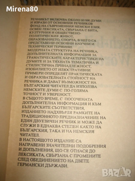 Изд. Атлантис, второ допълнено издание. Редактор: Любомира Въжарова. Твърди корици, 1070 стр. Съдържа около 60 000 думи от всички области на немския език. Отлично състояние !
