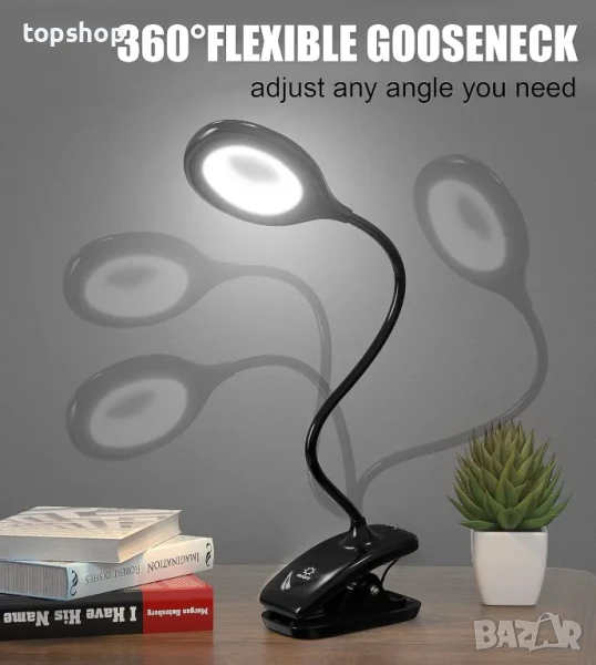 【Гъвкаво гърло и широка скоба за тежки условия】 Закопчаващата се лампа с 360° мека гъша шия за регулиране на ъгъла на светлината, за да свети там, където е необходимо. Освен това може да се сгъне в малка лампа, която е толкова удобна, когато пътувате. По-здравата широка скоба до 2,3"(макс.) се закрепва стабилно по-стабилно към бюро, маса, табла на леглото, спестява повече място от стоящата настолна лампа. Силиконова подложка върху цилп ви осигурява затягане без надраскване и защитава вашите мебели за дома, офиса, художествената работилница и др.