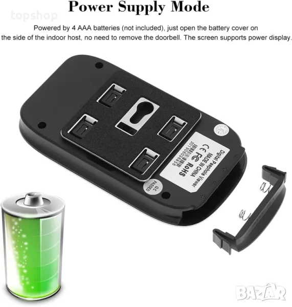 Режим на захранване: Захранва се от 4 AAA батерии (не са включени), просто отворете капака на батериите отстрани на вътрешния хост, няма нужда да сваляте звънеца. Екранът поддържа захранване.