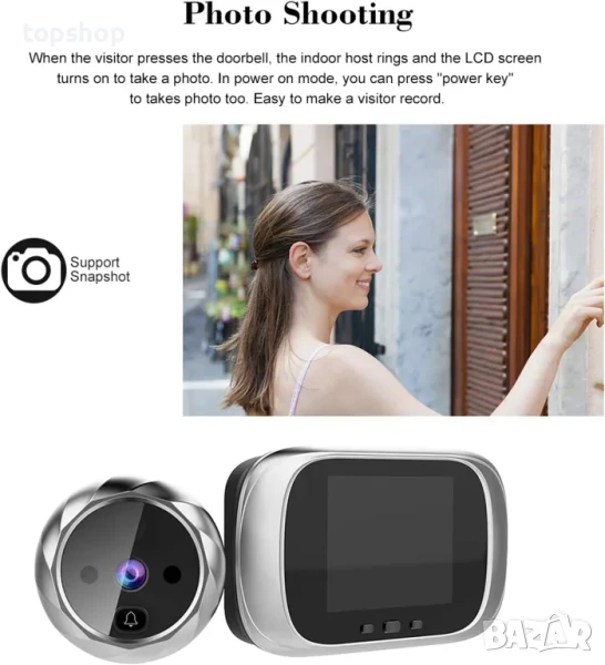 Снимане на снимки: Когато посетителят натисне звънеца на вратата, вътрешният хост звъни и LCD екранът се включва, за да направи снимка. В режим на захранване можете да натиснете бутона за захранване, за да направите снимка. Лесно е да се направи запис на посетител.