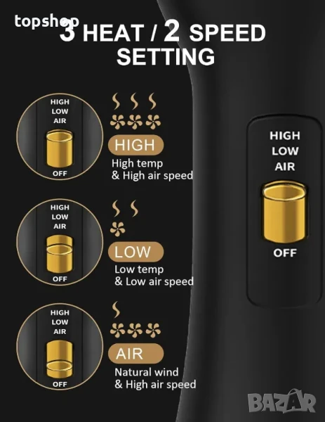 【Подходящ за всички типове коса】3 настройки за топлина/скорост с опция за охлаждане осигуряват гъвкавост при стилизиране и страхотни резултати за всички типове коса. Salon Blowout за половината време. По-бързо изсъхване и салонни резултати