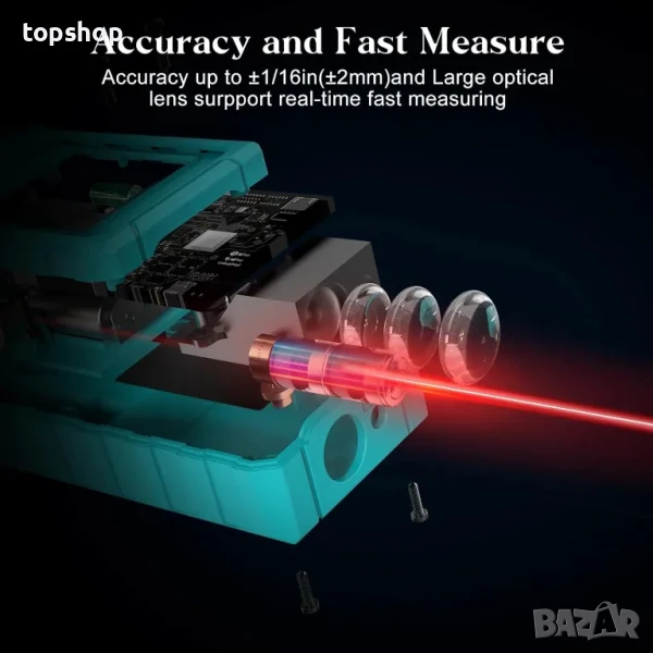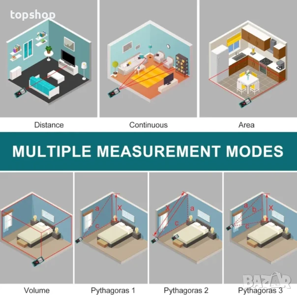 【МНОГОФУНКЦИИ ЗА ИЗМЕРВАНЕ】 Площ, разстояние, дължина, обем, непрекъснато измерване, метод на Питагор - три точки; събиране и изваждане; индикатор за изтощена батерия; 99 комплекта памет за данни; ръчно изтриване на данни; автоматично изключване след 150 секунди без работа, спестяване на енергия.