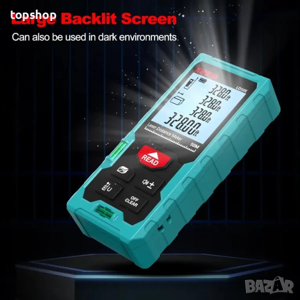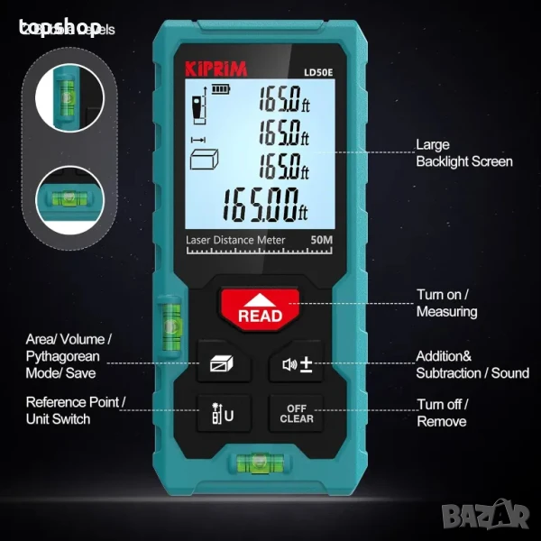 Лазерна ролетка Kiprim LD50E 50M, 2 нивелира, LCD дисплей с подсветка, превключване метри/футове/инч