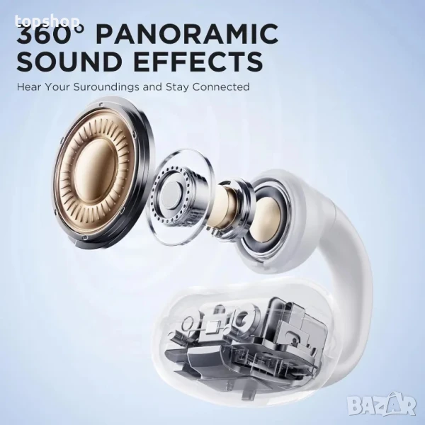 360° панорамен звук: Безжичните Bluetooth слушалки с отворено слушане използват 360° панорамна технология за виртуално миксиране. Когато се носят, панорамното съраунд звуково поле със стерео звукови вълни е като да сте на сцената, а упражнението е по-вълнуващо. Отвореният дизайн без поставяне в ухото ви позволява да слушате музика или да четете блогове на пътя, докато наблюдавате обкръжението си и гарантирате личната си безопасност.