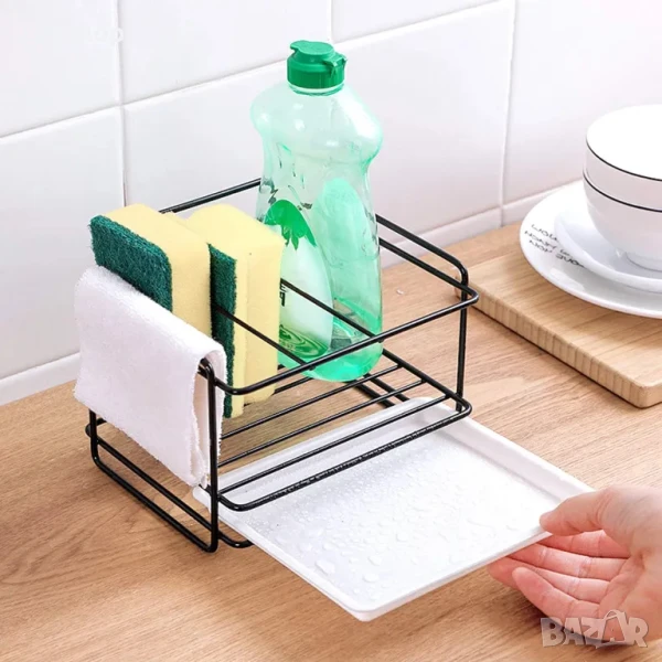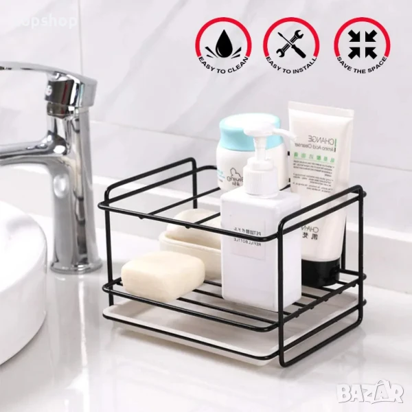 НОВ държач за кухненски прибори, метален, за кухня и баня с корито за оттичане, лепиенка...