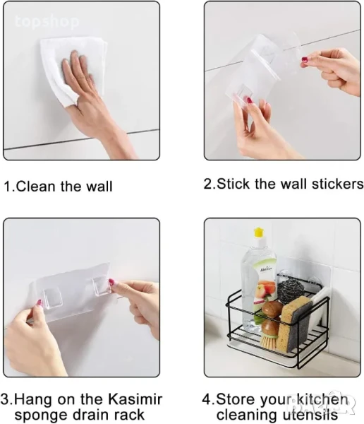 Всяка инсталация: Поставката за гъби Kasimir може не само да се постави върху равна повърхност, но и се предлага с две лепящи ленти, което ви позволява да я закрепите към стената. В зависимост от вашите нужди, имате различни приложения.