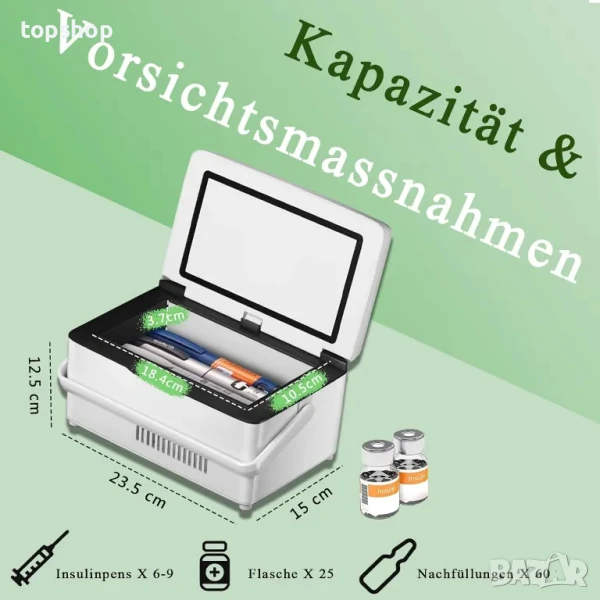 Дизайн с голям капацитет: вътрешните размери са: 18,5 см х 10,5 см х 3,7 см, може да побере около 6-9 писалки за инжектиране / 25 инсулинови бутилки / 60 пълнителя. Вградени 3 батерии, време на готовност на преносимата батерия повече от около 24 часа, независимо разсейване на топлината може точно да контролира температурата от 0-18 ℃
