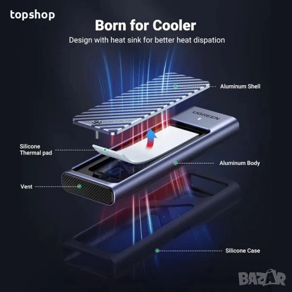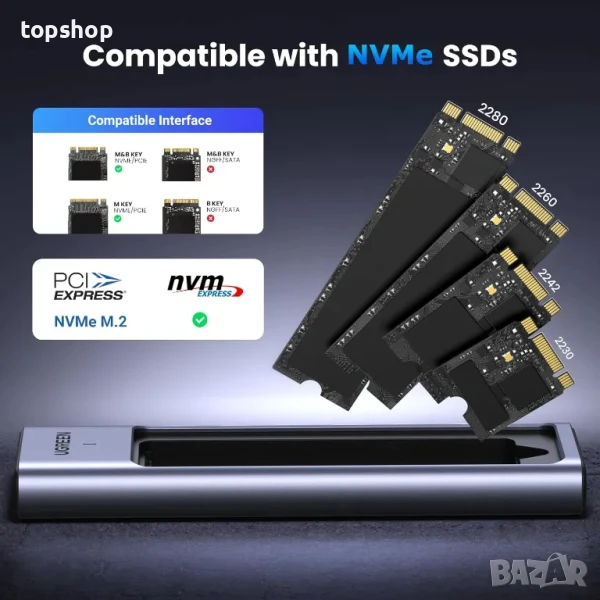 кутия UGREEN, USB 3.2, 10Gbps, PCIe M.2 към USB адаптер. Алуминиев корпус Поддържа UASP Trim за NVMe SSD M B+M Размери 2230 / 2242 / 2260 / 2280