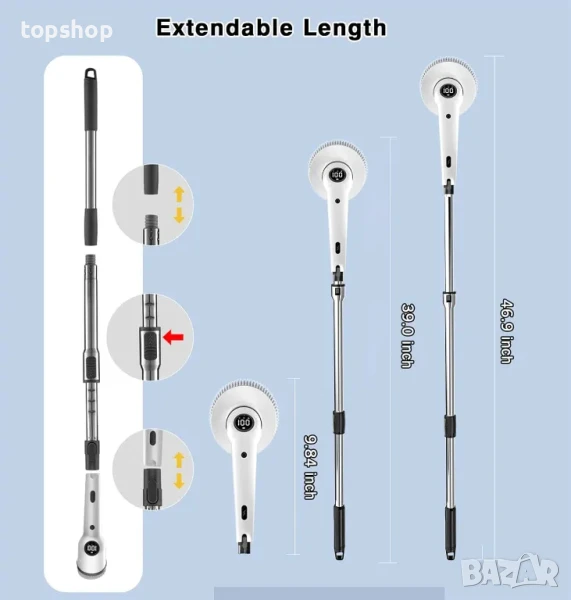 【Дизайн на безжичен скрубер и 9,84-46,9 инча, който може да се отделя】 - Пестене на енергия за почистване на всички мръсотии с мащабируема дължина от 9,84 инча до 46,9 инча, този скрубер ви помага да бъдете по-преносим и по-бърз за почистване на баня, вана, душ, плот, печка, мивка, стъкло, плочки, вана и т.н. Абсолютно добра помощник за почистване.