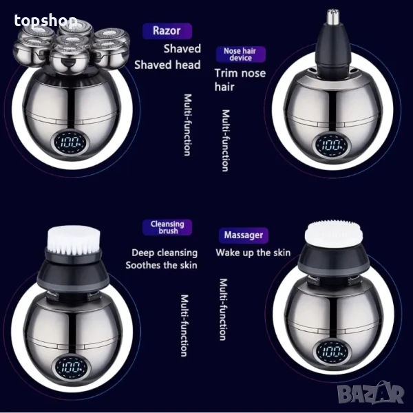 【Универсална машина】 Комплектът електрическа самобръсначка за глава за мъже се предлага с 5 подвижни аксесоара, включително ротационна самобръсначка, машинка за подстригване, тример за косми в носа, четка за почистване на лице, тример за тяло и четка за масаж. Нашата самобръсначка за глава в ръка за вашите нужди от подстригване, бръснене, подстригване на носа, почистване.