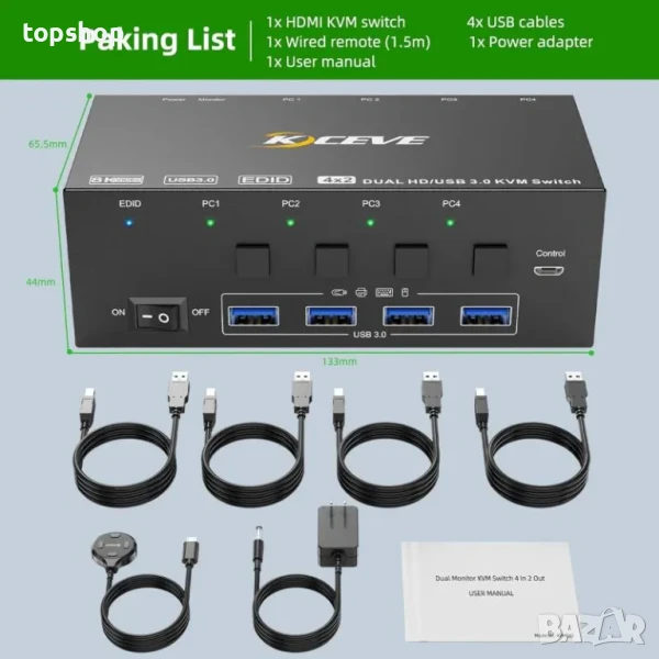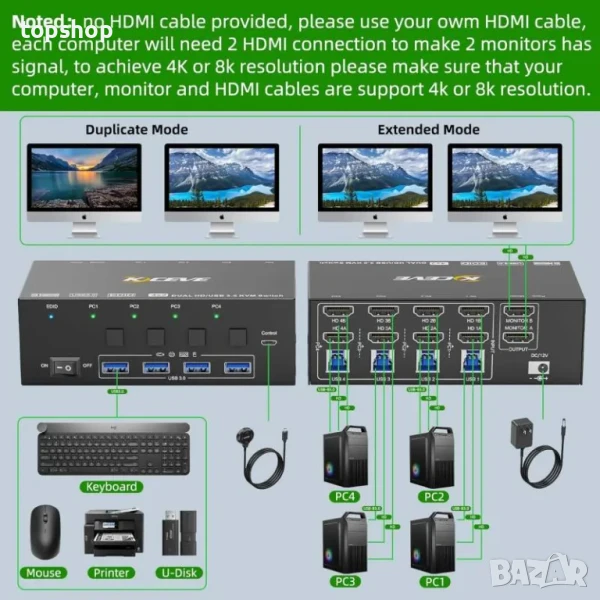 Този KVM превключвател с 2 монитора ви позволява да контролирате 4 компютъра или лаптопа (само лаптопи с докинг станция, която осигурява 2x HDMI) само с един комплект кабелна или безжична клавиатура/мишка.