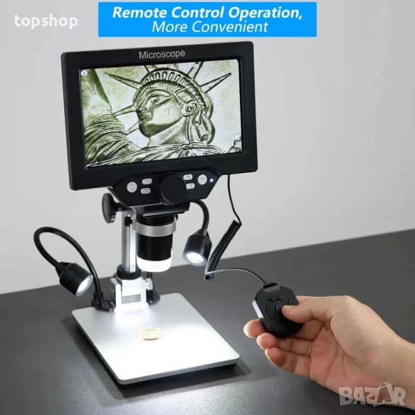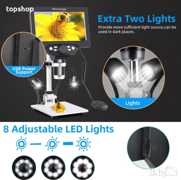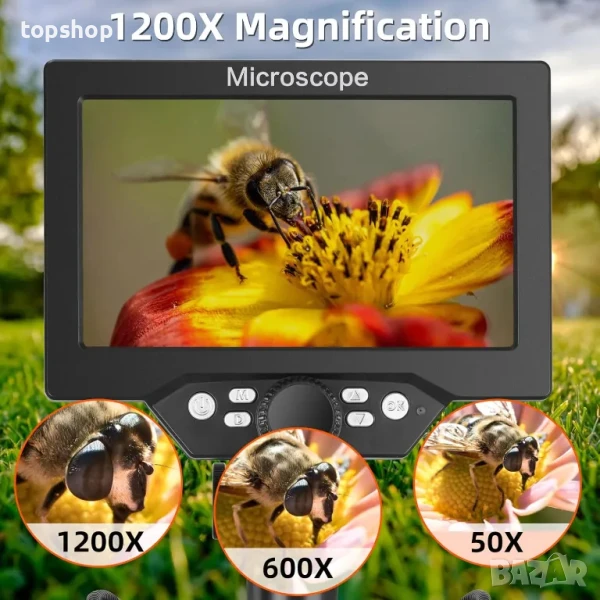 Голям LCD екран: Цифровият микроскоп е оборудван със 7-инчов дисплей с висока разделителна способност, по-ясно и удобно наблюдение, намаляване на зрителната умора. 12 мегапиксела, 1-1200 пъти непрекъснато увеличение