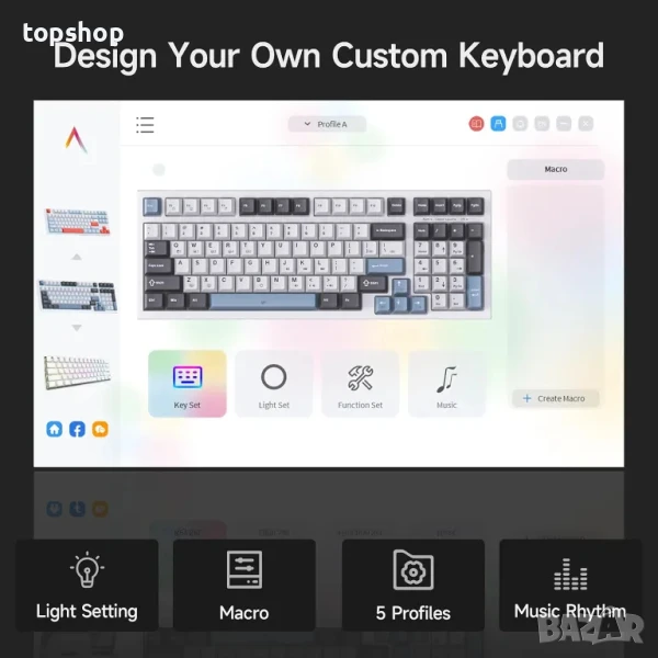 Софтуерна поддръжка Софтуерът на клавиатурата K98SE предоставя множество функции за персонализиране и подобряване на вашето клавиатурно изживяване. Тя поддържа до пет профила, като всеки профил позволява различни назначения на клавиши, настройки на макроси и конфигурации на фона, за да отговори на вашите разнообразни нужди. В момента поддържа само Windows.