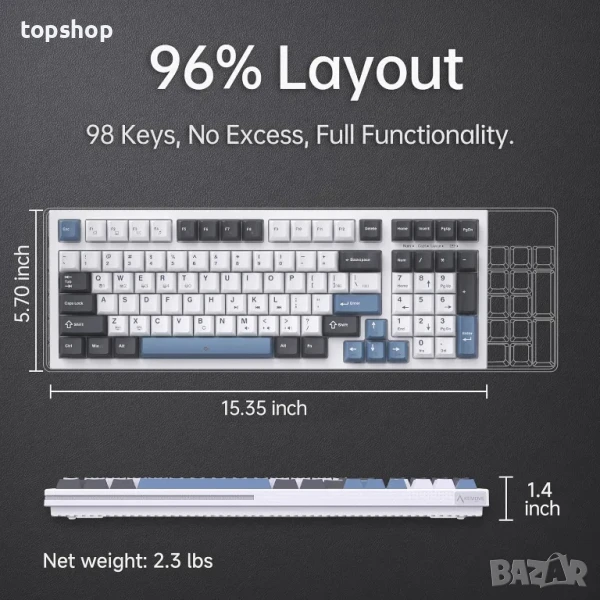 K98SE Механична геймърска клавиатура, 98 клавиша с LED подсветка, 96% QWERTY US подредба, кабелна...