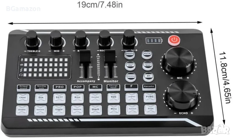 Пълноценно: този комплект звукови карти на живо съдържа почти всички обичайни функции за излъчване, като миксиране, регулиране на високите и ниските честоти, намаляване на шума, акомпанимент, избягване, промяна на гласа и елиминиране на оригиналния звук в песента. В допълнение, миксерът има BT радио връзка, което е много практично.
