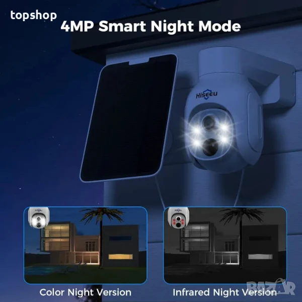 4MP изображения и пълноцветно нощно виждане -- Безжичните системи за видеонаблюдение Hiseeu поддържат 4MP резолюция, с 5× цифрово увеличение (не може да се вижда по-ясно), много по-ясно от 1080P, което гарантира, че можете да виждате по-ясно детайлите през деня и нощта. PTZ камерата за външна употреба с Wi-Fi поддържа цветно/интелигентно/инфрачервено нощно виждане. Дори при пълна тъмнина, тя може да осигури цветно изображение с цветно нощно виждане, гарантирайки, че обекти в рамките на 60 фута (18 метра) могат да бъдат ясно наблюдавани.