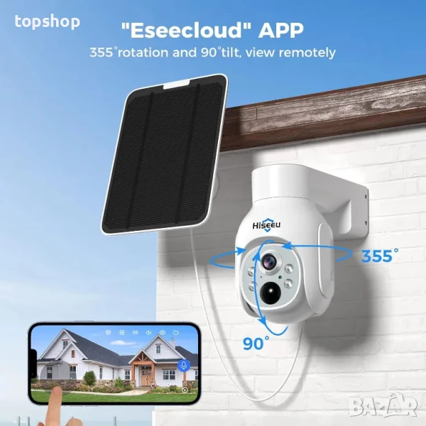 Отдалечен преглед и споделяне от множество устройства със семейството -- Hiseeu батерийните CCTV системи с камери могат да предоставят отдалечен преглед на живо и възпроизвеждане по всяко време и навсякъде (чрез инсталиране на приложението "Eseecloud"). Също така можете да споделите устройството с цялото си семейство, няма ограничение за броя на членовете му, така че те да могат да гледат камерата едновременно. Но споделената камера не може да получава известия за аларма.