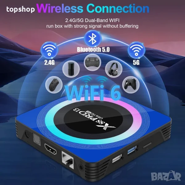 【2.4G/5.8G WiFi 6 & BT 5.0】Android TV Box поддържа 2.4GHz+5.8GHz двубандов WiFi 6 с 1000M Ethernet осигурява стабилна и надеждна работа на мрежата. С вграден BT5.0 лесен за свързване с вашите мултимедийни устройства, мишка, акустика или слушалки. Телевизионната кутия има функция Mirroring Cast за предаване на видеото от вашия телефон и таблет на големия телевизионен екран.