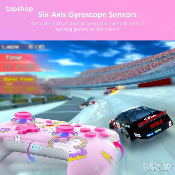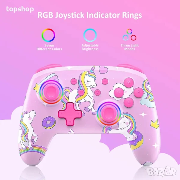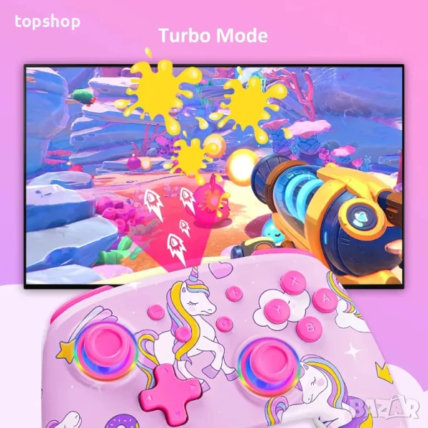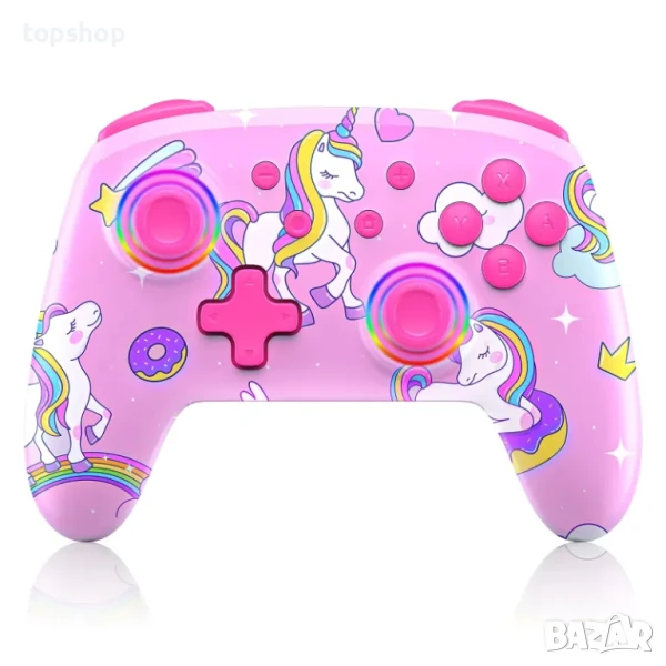 НОВ НЕОТВАРЯН джойстик NexiGo NS32 (без мъртва зона) за Switch/Switch Lite/OLED, Bluetooth безжични контролери за Nintendo Switch с вибрация, движение, турбо и LED светлина, подарък за геймър момичета (розов еднорог)