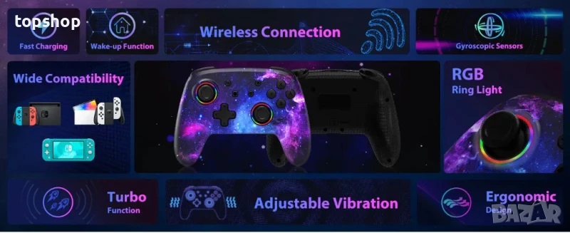【Двойни мотори и шестосен жироскоп】 Този контролер се предлага с двойни двигатели с тактилна обратна връзка и шестосни жироскопични сензори, за да ви осигури завладяващо игрово изживяване.