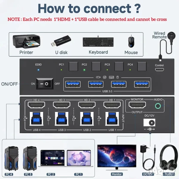 【USB 3.0 HDMI KVM превключвател 4 компютъра 1 монитор】Този 4-портов HDMI KVM превключвател ви позволява да управлявате 4 компютъра само с един комплект мишка и клавиатура за монитор. Можете лесно да превключвате между четири компютъра на 1 монитор и да споделяте 4 USB 3.0 устройства.