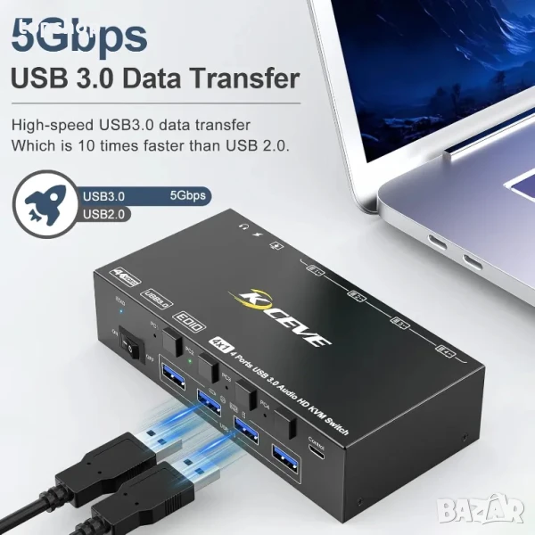 【KVM превключвател с 4 USB 3.0 порта】HDMI USB превключвател с 4 USB 3.0 порта, който може да разпознава безжична клавиатура, мишка, принтер, скенер и други USB устройства. Поддържа ултрабърз USB 3.0 трансфер на данни, скорости на трансфер на данни до 5Gbps, обратно съвместим с USB 2.0 и USB 1.1 устройства.