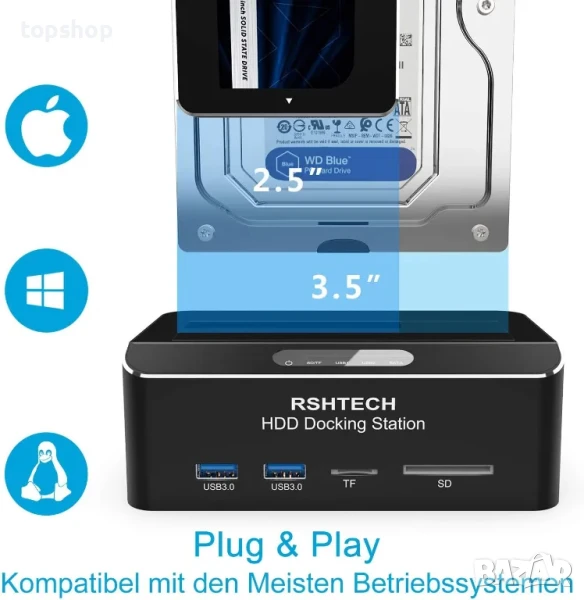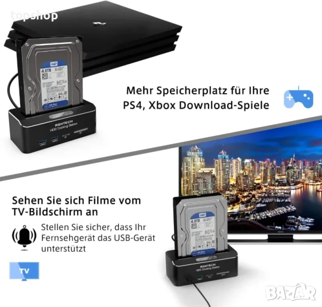 【Широка съвместимост】 Докинг станция за твърди дискове и SSD RSHTECH, съвместима с Windows 2003 / XP / Vista / Win 7 / Win 8 / Win 10, Mac OS, Linux 9 и по-нови версии, PS4, PS4 Pro, Xbox 360, Xbox One и обратно съвместима с USB 2.0 / 1.1. Докинг станцията за твърд диск поддържа само SATA HDD и SSD твърди дискове.