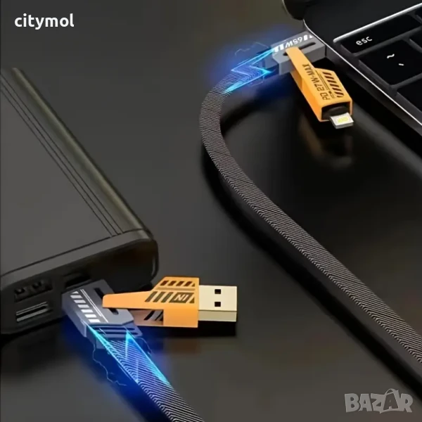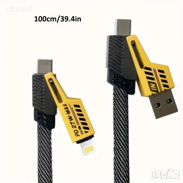 Кабел за бързо зареждане и трансфер на данни 4-в-1 USB-C PD 65W/27W, 1M - Type-C, USB-A, Lightning, Съвместим с iPhone, iPad, Samsung, Huawei, Android, лаптопи и Power Bank.