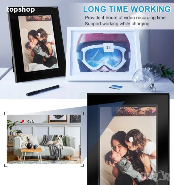 Перфектен за декорация. Уникален дизайн на рамка за снимки, която можете да поставите на бюра и рафтове или да я закачите на стената във вашия дом и офис. Многофункционалната камера с фото рамка е най-добрият избор за декорация и сигурност на дома/офиса