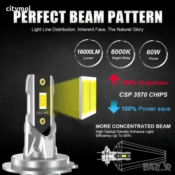 - Технология: COB Chip за по-добра светимост и дълготрайност. - 60W, 16000 lm, бяла светлина 6000k