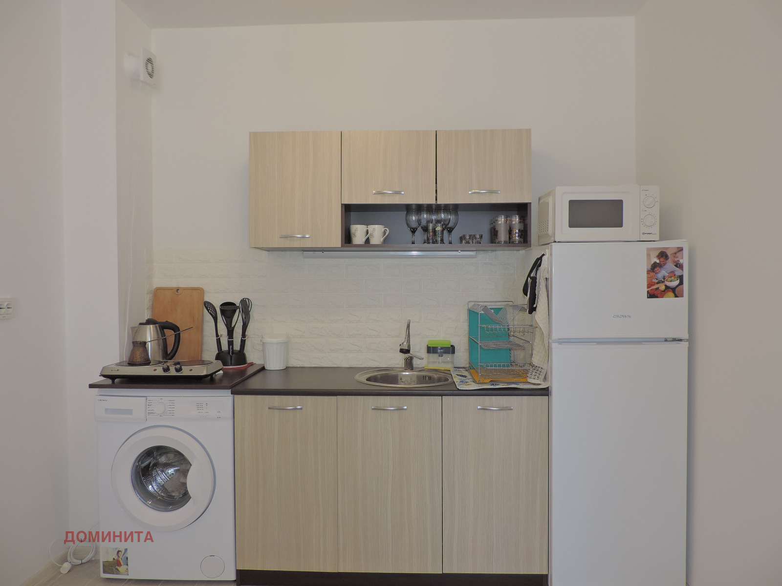 Предлага се обзаведен - кухня с пералня, хладилник, котлони, микровълнова.