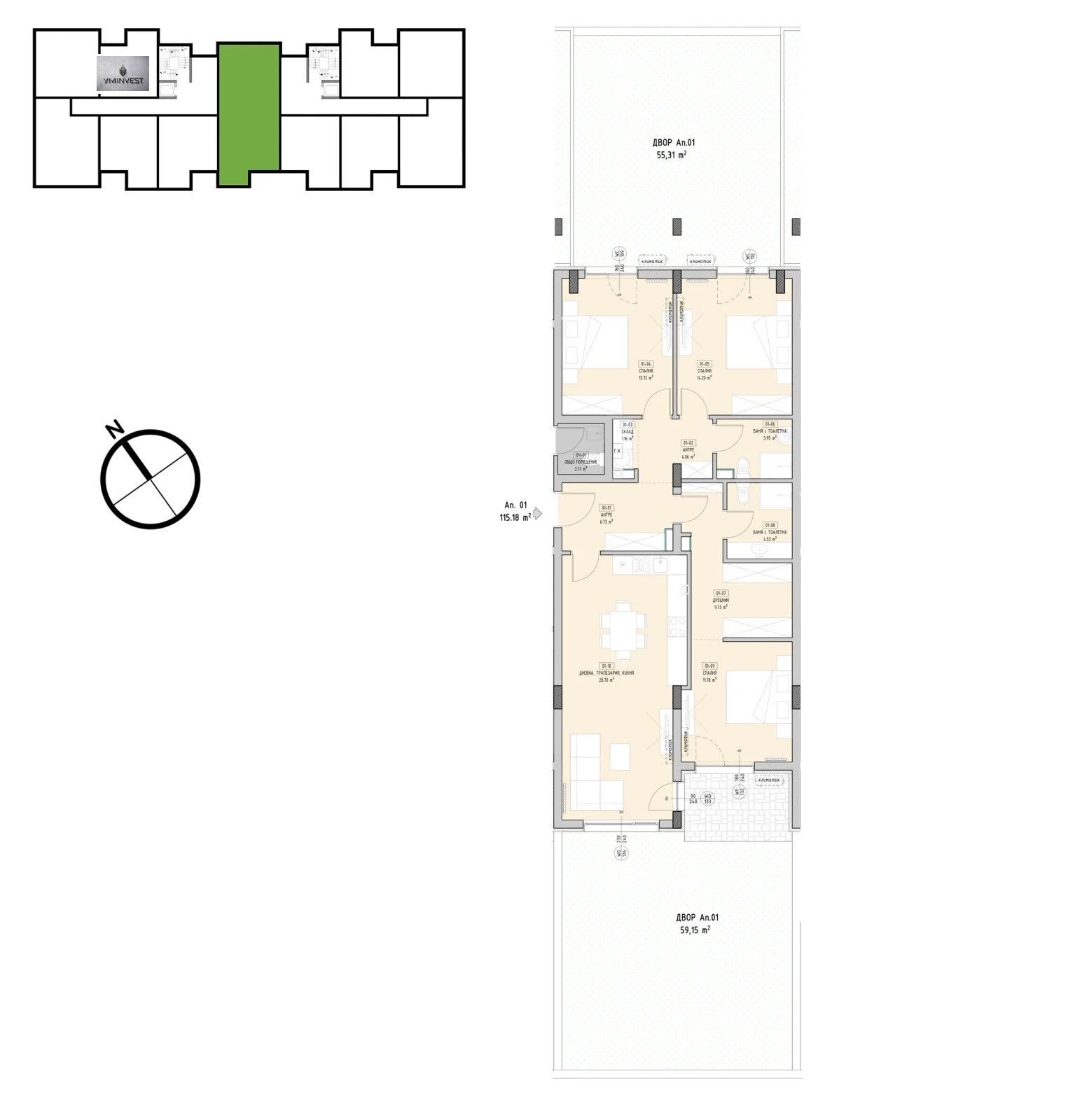 Разпределение: антре /6,73 кв.м./, дневна с кухненски бокс /28,70 кв.м./, второ антре /4,06 кв.м./, спалня /13,72 кв.м./, втора спалня /14,20 кв.м./, трета спалня /11,78 кв.м./ с дрешник /9,73 кв.м./ и баня с тоалетна към нея /4,53 кв.м./, втора баня с тоалетна /3,95 кв.м./ складово помещение /1,16 кв.м./ и два прилежащи двора /55,31 кв.м. и 59,15 кв.м./.