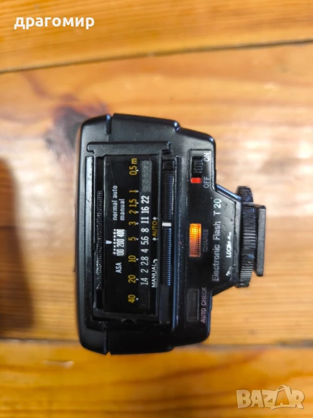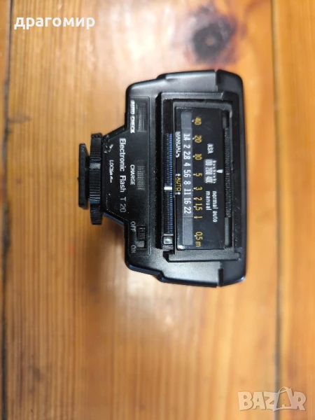 продавам светкавица OLYMPUS Electronic Flash T 20, работи с две батерии АА по 1, 5 v, имам още много други фотоапарати, камери, обективи, чанти, светкавици, батерии, зарядни устройства, касети, филтри, ремъци, ленти, при закупуване на повече неща отстъпка