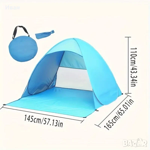 Разпъваща се за секунди плажни палатка в стил POP UP, осигуряваща ефикасна защита от силните слънчеви UV лъчи. Особено неохбходима, когато сте с деца на плажа. Палатката се разтваря автоматично, щом се извади от калъфа. Изработена от специален материал с висококачествена UV защита. След употреба може да сгънете палатката и да я приберете в предназначеният калъф с цип. Лесно и компактно за съхранение и пренасяне