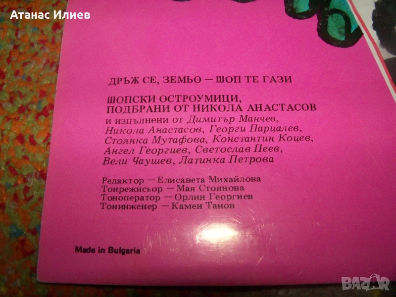 "Дръж се земьо шоп те гази" шопски осторумици с Георги Парцалев, Никола Анастасов, Стоянка Мутафова и др. Плочата е прослушана и е в отлично състояние.