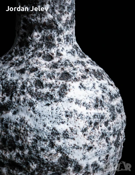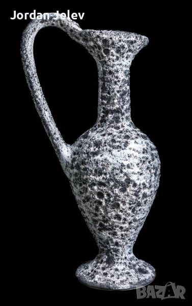 ✨ Изключителна ръчно изработена керамика от средата на миналия век, дело на френския майстор Marius Giuge, създадена в прочутия регион Валарис (Vallauris), Франция – световноизвестен център на артистична керамика. Вазата е с характерна лава текстура в черно и бяло, с елегантна дръжка и издължена форма.