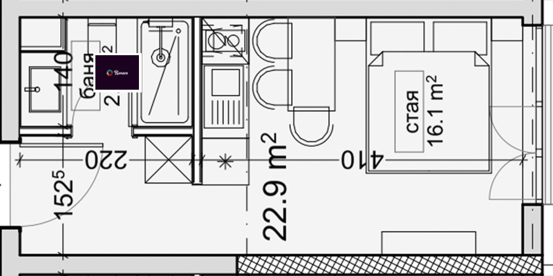 Апартаментът е разположен на партерен етаж и състои от антре, дневна с кухненски бокс, баня с тоалет в едно. Жилището е функционално, помещенията са светли без скосове.