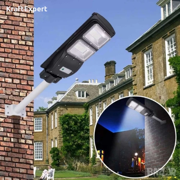 Икономия - лампата се захранва от слънчева енергия, благодарение на която можем да осветим всяко място без да използваме електричество. Соларният панел и батерията осигуряват захранване за използване на устройството без нужда от поддръжка.Ще осветявате затъмнени места - лампата разполага със сензор за движение , който включва осветлението при засечена активност в обхвата на работа на детектора.Възможност за използване през цялата година - работи безпроблемно през зимата и в облачни дни, когато няма много слънце.Сензор за здрач - устройството е снабдено със сензор, който реагира на промени във външното осветление и при недостатъчна светлина активира възможността за включване на светлината.3 режима на работа: (режимът на работа се сменя с дистанционното управление или бутона в лампата)1. Лампата ще се включи на 100% мощност при засичане на движение и ще се изключи след 30 секунди, ако няма движение.2. Лампата свети постоянно на 30% мощност, а при засичане на движение свети на 100% мощност. След това, когато няма движение, той ще се върне на 30% мощност.3. Лампата свети през цялото време на 50% мощност, независимо дали засича движение.Системата е изцяло автономна, през светлата част на деня се зарежда батерията, а веднага след като се стъмни осветлението се включва автоматично, благодарение на сензорите които са в соларния панел.Соларната улична лампа е интелигентна система за външно осветление, която интегрира най-добрите енергоспестяващи части – фотоволтаичен панел, осветително тяло, сензор, контролер и литиева батерия, всичко това в една кутия.През деня високоефективният слънчев панел събира енергия от слънцето и я съхранява в усъвършенстваната литиева батерия.През нощта мощният светодиод автоматично ще се включи, за да осигури светлина.Опция за светене когато се установи движение, COB ще увеличи яркостта, за да осигури изобилие от допълнително осветление за всеки в района.След 20-30 секунди или когато движението вече не е открито, светлината ще се изключи, за да спести енергия.Тази интелигентна функция позволява на соларната лампа, захранвана от слънчева енергия, да спестява енергия, когато никой не е в обхват и няма необходимост от светлината, което означава много по-дълго време на работа, отколкото бихте очаквали от подобно соларно осветление. Предимства:добра стабилностдълъг живот,висока ефективност на светлината,от COB диода и лупаталесен монтаж и поддръжка,високи показатели за безопасност,икономия на енергия и защита на околната среда.икономично и практично предимство.Лампата е влагозащитена и подходяща за външен монтаж като осветление за пътищата, паркове, градини, вили, външен паркинг, както и навсякъде, където липсва електрозахранване или има нужда от автономно осветление.Характеристики:COB мощност: 900WОсветеност: 2500 луминаЪгъл на осветяване: 120 градусаБатерия: Li-ion 10AHВреме за зареждане: 6-8 часа при добра осветеностВреме на светене: 25-30 часа при непрекъснато осветяване на пълна мощност.Височина на монтиране: 3-5m (препоръчителна)Разстояние между стълбовете(стени): 10-12mЗащита от вода и влага: IP65Цвят: 6000 КТемпературен диапазон (ºC) -20 +65 Размер на продукта 520 х 240ммСъвкупноста от соларен панел, управление и акумулаторни батерий позволява на соларната лампа да се захранва от слънчевата енергия, което прави лампата изцяло независима от е