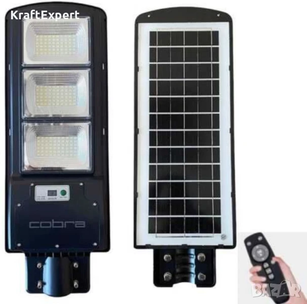 Соларна лампа Cobra Pro 1200W с дистанционни управления, лампа от ново поколение!Соларната улична лампа е интелигентна система за външно осветление, която интегрира най-добрите енергоспестяващи части – фотоволтаичен панел, осветително тяло, сензор, контролер и литиева батерия, всичко това в една кутия.През деня високоефективният слънчев панел събира енергия от слънцето и я съхранява в усъвършенстваната литиева батерия.През нощта мощният светодиод автоматично ще се включи, за да осигури светлина.Технически характеристики:Работно време 12 часаМощност на лампата: 1200WМатериал ABS + PV модулIP рейтинг IP65Слънчев панел 25W МоноLED чип BridgeluxРазмер на продукта 520 * 250mmСветлинен поток. 2500LM NW / GWбатерия Литиева батерия 40000mAhМатериали PVC/ABSОчакван живот (H) 50.000Ъгъл на лъча (º) 120Температурен диапазон (ºC) -20 +65