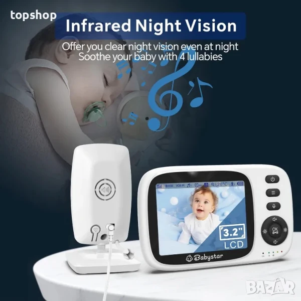 НОВ бебефон Babystar с камера и нощно виждане, 3,2-инчов екран безжичен, VOX, двупосочно аудио...