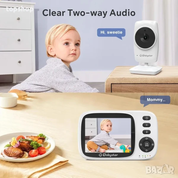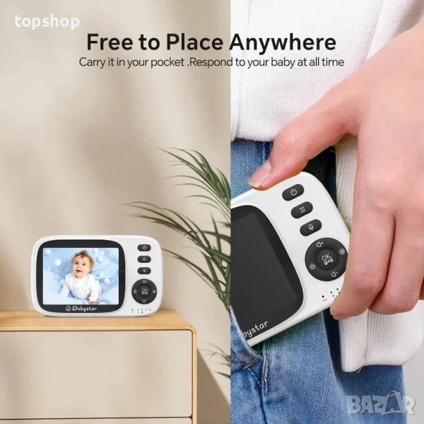 3,2-инчов HD екран и преносим дизайн: Този 3,2-инчов бебефон Babystar с камера е LCD екран, предлага ясно видео на вашето бебе, така че няма да пропуснете всеки момент от бебето. Заради преносимия му дизайн можете лесно да носите бебефон и да успокоявате бебето си по всяко време.