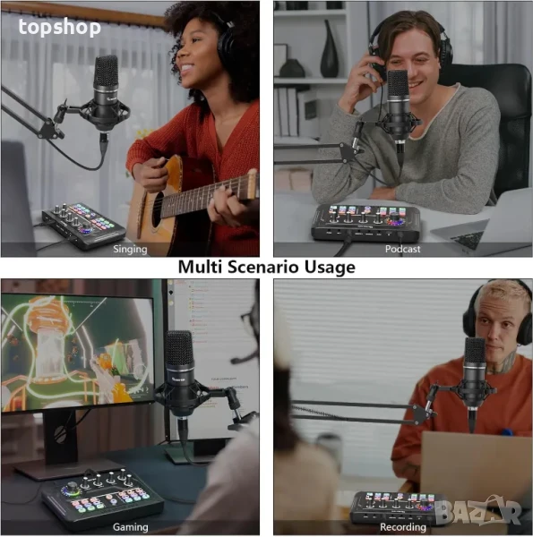 аудио миксер за компютър съдържа повечето от често срещаните функции на подкасти, като Tre & Bass, монитор, обратна връзка, промяна на гласа, интелигентен DSP чип и т.н., 3,5 mm кондензаторен микрофон, който записва силен, ясен и богат звук. този комплект оборудване за подкаст е много удобен за начинаещи и отговаря на вашите нужди от подкаст