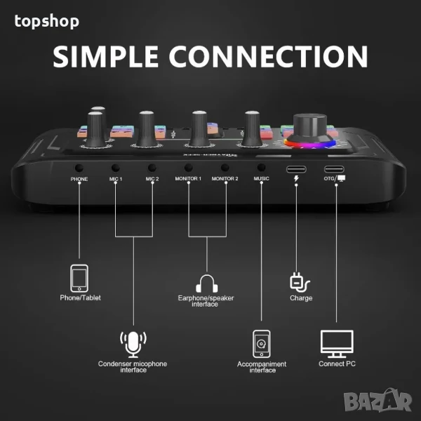 Безжична връзка: Този комплект подкаст микрофон е лесен за настройка. можете да свържете телефона чрез безжична връзка, за да осигурите музикален съпровод, удобно и практично. И тази звукова карта има функция за възпроизвеждане, пауза и смяна за музикален акомпанимент, въведена през BT. едно натискане за функция за пауза, натиснете отново за функция за възпроизвеждане, продължително натискане е за превключване към следващата песен