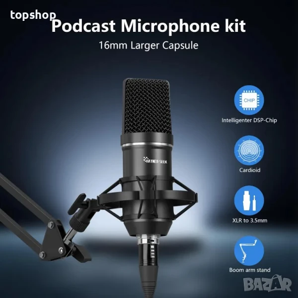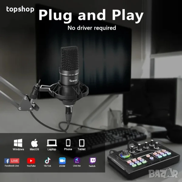 Нов пакет оборудване за подкаст, аудио интерфейс с dj миксер и кондензаторен микрофон за компютър/лаптоп/телефон, стрийминг/запис/подкастинг