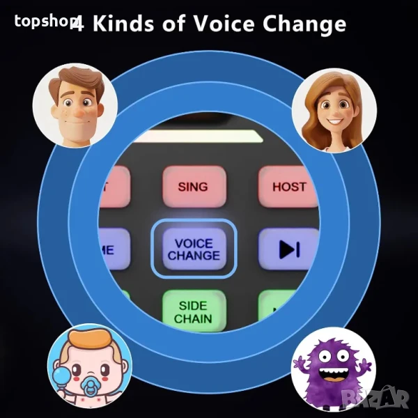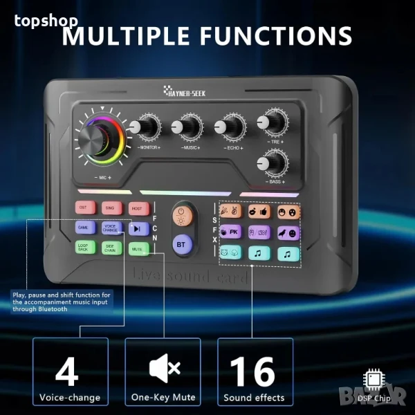 Специален звуков ефект: миксерът за аудио интерфейс има 4 гласови промени (мъжки/женски/бебе/чудовище) и 16 звукови ефекта. в допълнение, многофункционален подкаст режим, напр.: заглушаване с едно щракване, направете поточно предаване по-ефективно, звуковите ефекти и функционалността на звуковата карта добавят повече забавление и интерес към вашия подкастинг