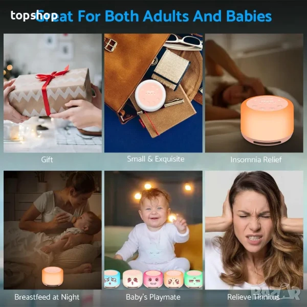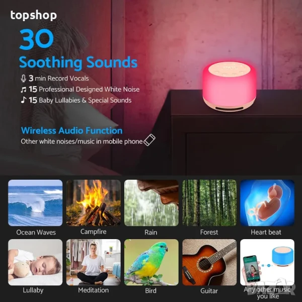 НОВА eSynic Машина за бял шум с 32 успокояващи звука и нощна лампа. Може да се ползва като блутут колонка. Преносима звукова машина 7 цветни нощни светлини Децата пътуват Създава бял шум, за да се насладите на съня. Релаксация