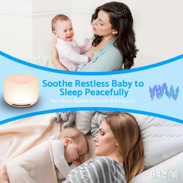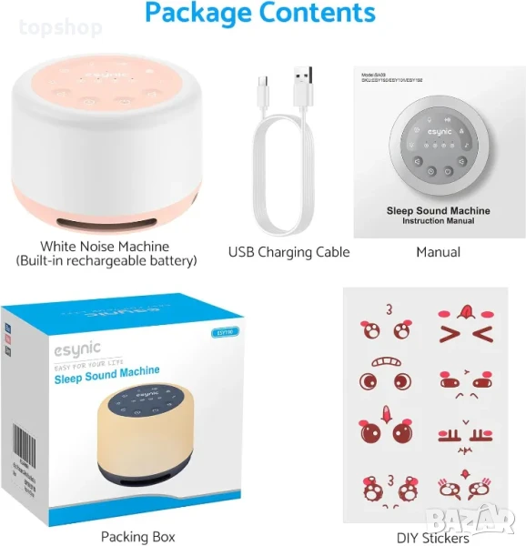 *До 30 успокояващи звука, които да ви помогнат да заспите*----: *Нашата бебешка преносима звукова машина eSynic с 14 вида бял шум от професионален дизайн, 6 вида уникални звуци 6 вида турален бял шум 4 вида бебешки звуци и т.н. Задоволете нуждата си от звуци. По-добре елиминирайте стреса и лесно заспивайте.