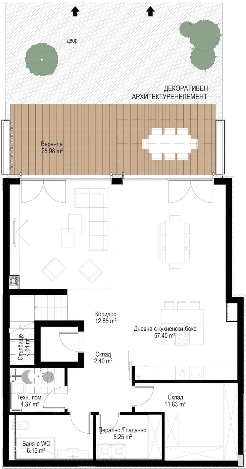 Просторна дневна зона с хол, подходяща за семейни събирания и развлечения, с директен достъп до уютен самостоятелен двор. На нивото са разположени още складово помещение, перално/гладачно помещение, баня с тоалетна и техническо помещение.