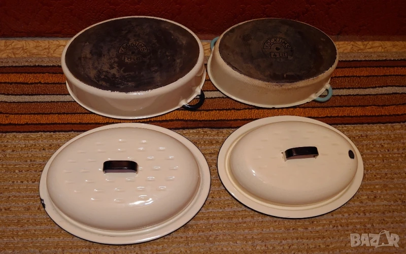 Класически емайлирани тенджери Kockums с чугунено дъно. Маркирани с обем 5 и 4 литра. Масивни и тежки - практически вечни. Made in Sweden. Размери на снимките. Посочената цена е за двете. Комплектът може да се раздели при цена - 95 лв. брой.